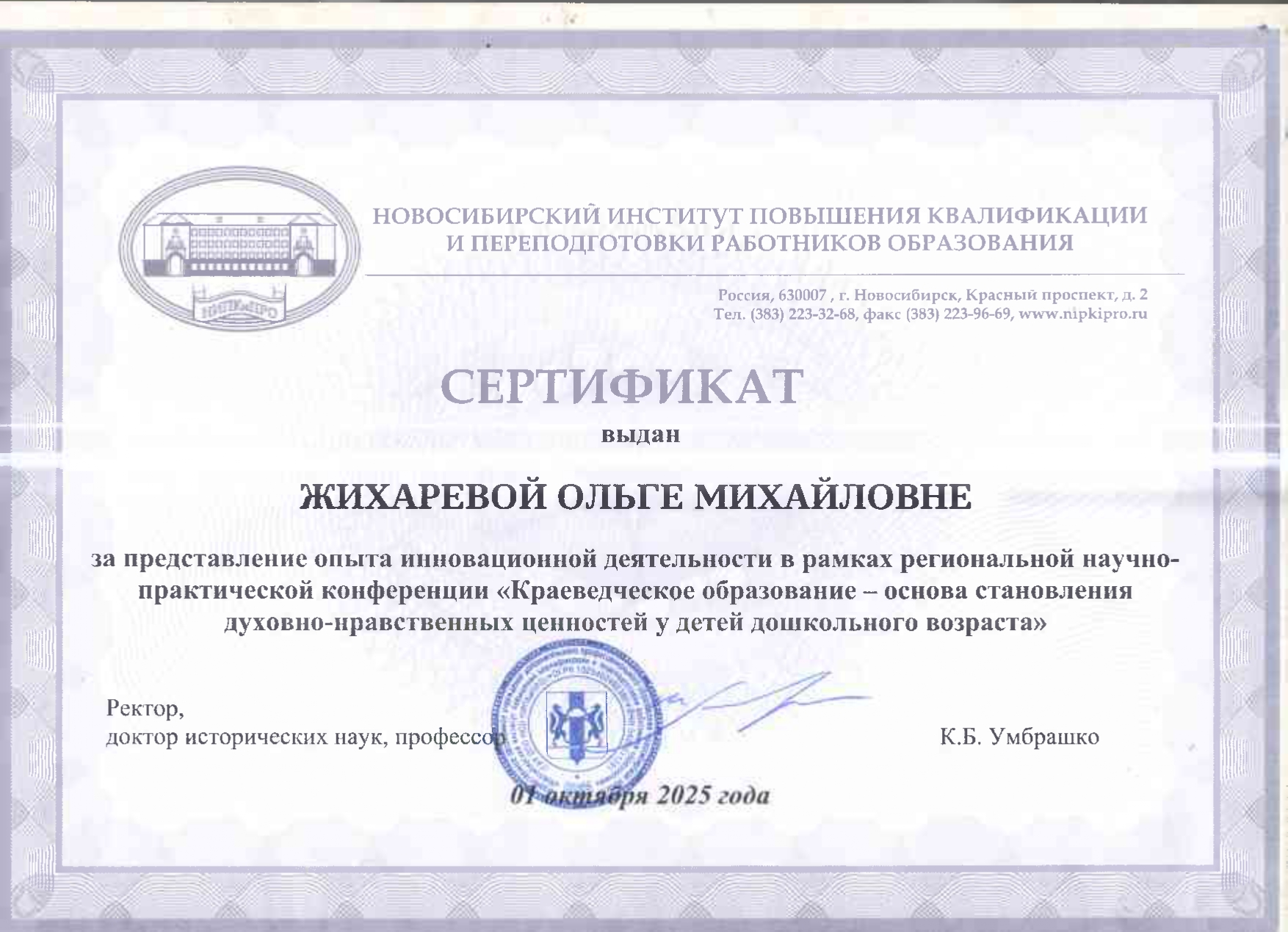 Сертификат за представления опыта инновационной деятельности в рамках региональной научно-практической конференции "Краеведческое образование-основа становления духовно-нравственных ценностей у детей дошкольного возраста", 2025